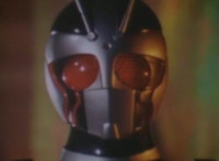 Close on Masked Rider's glowing helmet. |