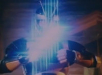 Zoom in on Super Gold, Robosect reacts, then Super Gold connects hands and materializes his Ecto Ray in his right hand, which finishes forming while held beside his thigh. Super Gold then raises it up, as Robosect pulls out his own blaster, to which Super Gold spots it immediately and fires fire, bursting the weapon in Robosect's hand. |