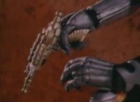Close on Robosect talking with his hand held up. |