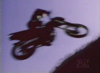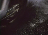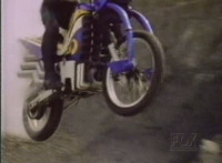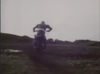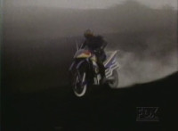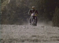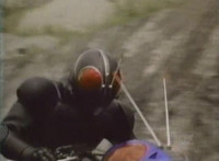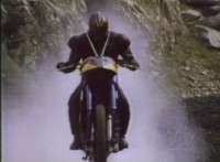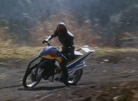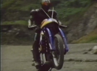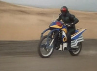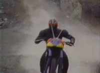 Zoom in on Masked Rider, as he starts Combat Chopper, and drives him across a black dirt location. |