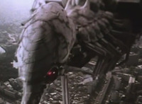 Masked Rider leaps off Combat Chopper, Larvatron reacts, then gets struck with energy bolt and explodes. |