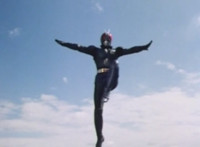 Masked Rider gestures before leaping up off of Combat Chopper. |