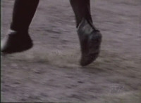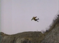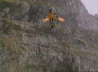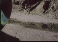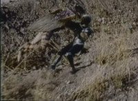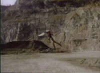 Push in on Combat Chopper's front wheel, as Masked Rider drives him quickly 'cross the quarry. |