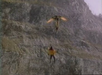 Hydrasect floats high in the air, keeping a loose hold on Bjorgy. |