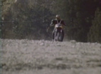 Masked Rider continues riding Combat Chopper up over a hill on the horizon. |