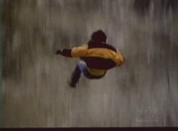 Masked Rider flips over in the air, and lands on Combat Chopper, racing forth without stopping. |