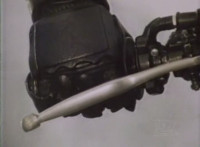 Masked Rider puts his foot on Combat Chopper's kickstart, grips the handlebar, and the exhaust pipe releases its contents. |