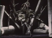 Arachnida snags Masked Rider's feet, and drags him up onto her half-pillar. |