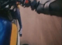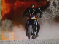 On the horizon, Masked Rider rides Combat Chopper up over a hill. Then, a close-up of Masked Rider riding Combat Chopper. |