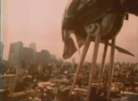 Heliotoid takes a jolt to his antennae from the sunbeam, then fires eyebolts upward, hitting Masked Rider, bursting him, but not stopping him landing a blow into Heliotoid, knocking him into the air, where he lands atop a nearby roof. Masked Rider looks up at him, as he points and talks, then departs. |