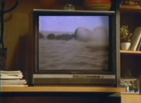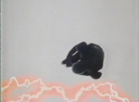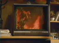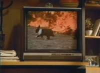 A fire rages in the forest, the cameraman is suddenly distracted from the flames by a bird flying overhead. A black & white rabbit flees the burning bushes. |