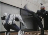 Heliotoid watches, as Masked Rider leaps in, passes by him, then throws a kick that he ducks under. |