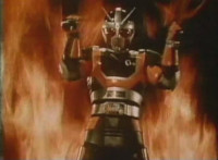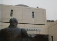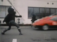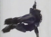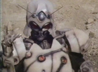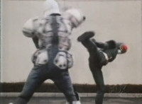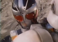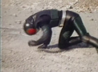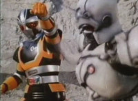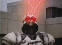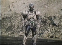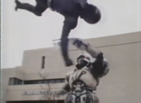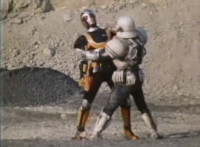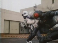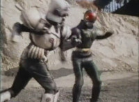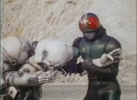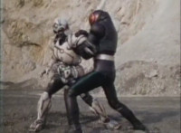 Masked Rider flips over Heliotoid, who assists him in this, causing his landing to be rough and on his back. Masked Rider recovers as he faces Heliotoid across the lot. |