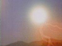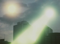 The sun fires an energy beam down, charging up the antennae of Heliotoid, who fires eyebeams upward. |