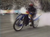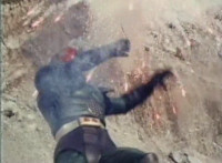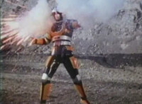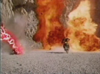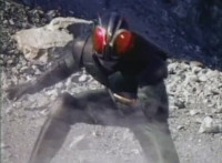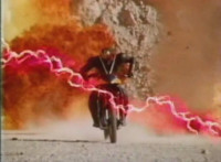 Masked Rider rides Combat Chopper through the quarry as eyebeams cause explosions all around him. |