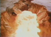 Eyebeams crash into energy beam, sending the beam straight into the ground. Huge crack in the ground, sides spreading out with dirt & debris falling between, as a large fireball bursts upward from within, spewing flames upward continuously. |