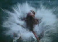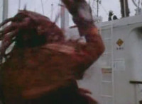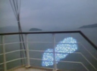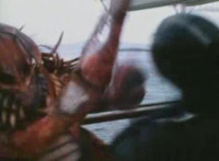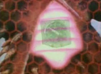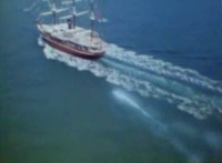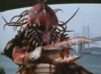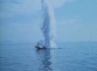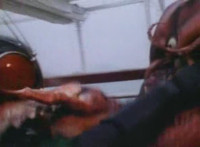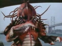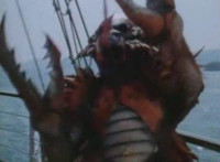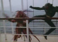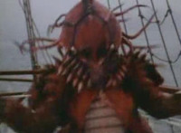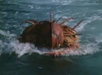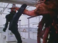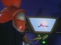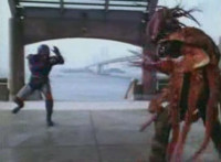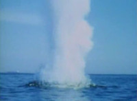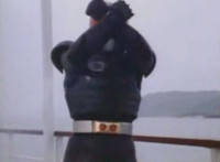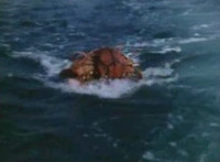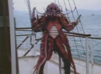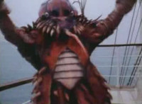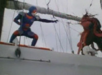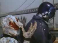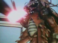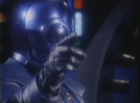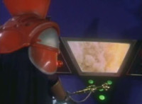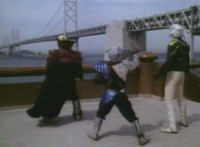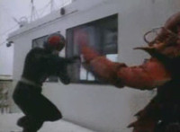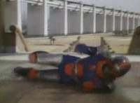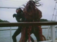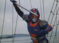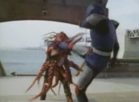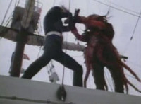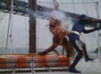 Super Blue poses, Water Bug attacks, so he dodges, then hits him back, before grabbing his arms, and leaping up, taking Water Bug back onto the top of the cabin, where they break off. Super Blue pulls out his Blue Saber, and sparkily slashes Water Bug, cutting his belly open, revealing the time bomb within. Super Blue reaches in and plucks it out, looks at it, then tosses it overboard, where it explodes in the water, twice. |
