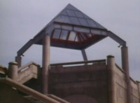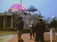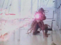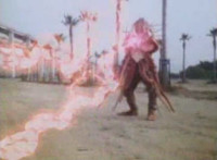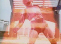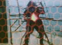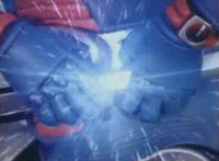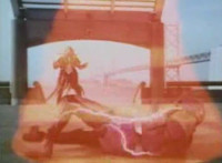 Super Blue makes his way up the stairs, having reached the gazebo area. He pauses, looks around, then Water Bug attacks him from behind, but Super Blue grabs him and rolls him over, then throws a kick at him, only to end up knocked back. Super Blue recovers, when he suddenly looks up and sees the energy beam showering down upon his exact position, engulfing him and causing him to crackle intermittenly as he collapses. Water Bug taunts and talks at him from a few feet away. |
