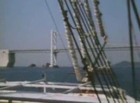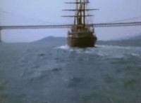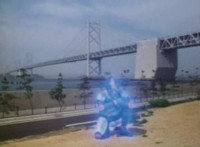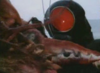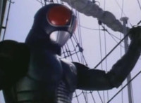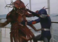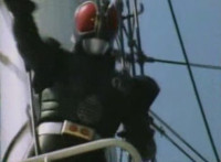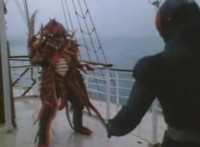Masked Rider poses a bit atop the mast, then leaps off, landing on the deck, where he begins to fight Water Bug, hitting him once, then getting locked up together with hands held in front. Masked Rider soon breaks free, knocking Water Bug back a few feet. Masked Rider motions to his forehead, and scans Water Bug, discovering a bomb in his glowing belly. Masked Rider speaks, as does Water Bug, also gesturing forth, causing Masked Rider to turn around and look at the bridge the ship is approaching. Masked Rider turns back around to face Water Bug, who talks some more during a slow zoom in. |