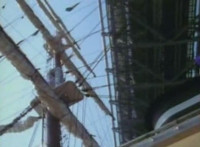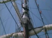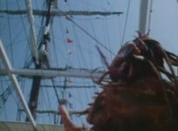 Masked Rider flips over the camera ,and lands atop the mast of the ship, overlooking Water Bug, who looks up and reacts, while Masked Rider gestures and speaks. |