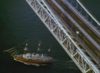 Super Blue looks on, then looks up, seeing the ship is passing under the bridge, safe and sound. |