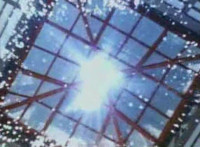 Super Blue slowly sits up, then summons up his Blue Saber, which he energizes and aims upward, a beam hitting the energy shower source in the skylight above, bursting it. Water Bug reacts, then charges at Super Blue, who dives out of his way, poses, then leaps up, giving Water Bug an uppercut on the way down. Water Bug is flung down the stairs to the lower lever. Super Blue poses. Water Bug speaks, then slowly backs away, and flees. Super Blue reaches out in protest, but leaps to follow, both landing on the beach. Super Blue poses, Water Bug fires electricity at him, he leaps up and flips over as explosion erupts behind him |