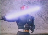 Masked Rider pulls his glowing Electro Saber from his Ecto Accelerator buckle. |