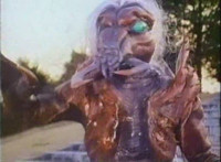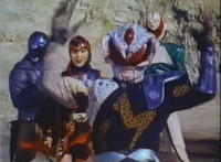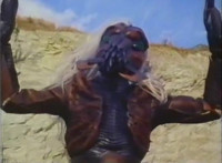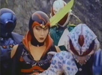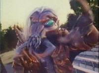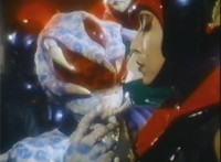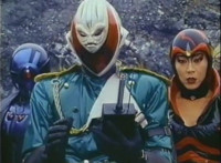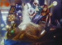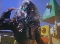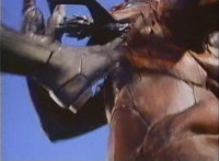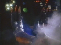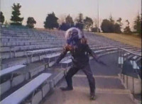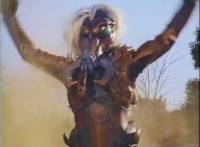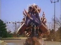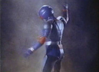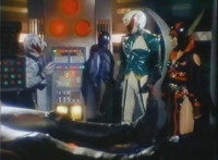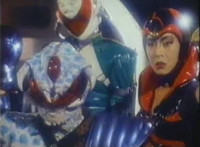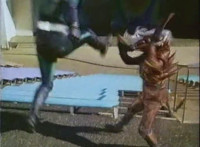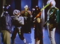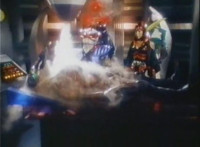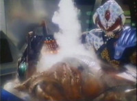 Super Blue leaps up and morphs into liquid form, then in that non-solid state, strikes into Twister Bug until he falls over before the Generals. Super Blue lands, poses, and reverts back into Masked Rider mode. Twister Bug, bodily smoking, reacts. Masked Rider nod-talks, then begins to reach for his Ecto Accelerator. |