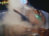 Pan down as the steaming spout pours steam down upon the tabled Twister Bug as Gork watches. More steaming, then Gork talks up close, before spinning around and talking to the three Generals behind him. He talks some more, addressing Nefaria directly, until she speaks. Gork suddenly looks to our left. |