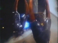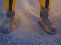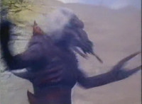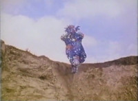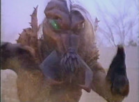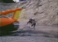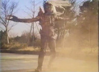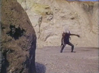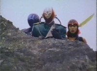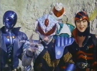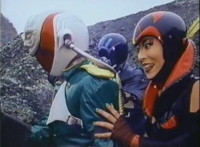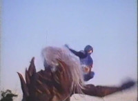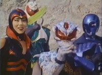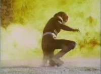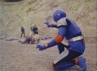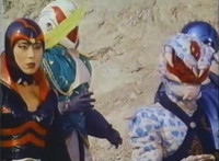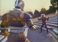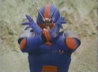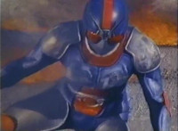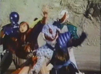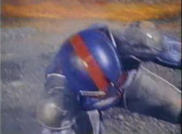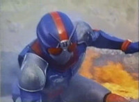 Super Gold is suddenly sand blasted, caking his joints and armor with thick dust. Twister Bug is delighted, then slowly approaches. Super Gold suddenly flashes gold and morphs into Super Blue, and just as quickly into liquid form, melting down into water and crawling off, de-sanding in the process. Twister Bug reacts, then Super Blue swoops past in liquid form, before solidifying, posing, then rushing forth and doing a flying kick into the monster, sending him fall and rolling. Twister Bug recovers, then begins to spin around in place, vanishing in a swirl of sand. |