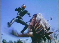 Twister Bug is kicked in the chest, causing him to fall and roll away from the landing Masked Rider. |
