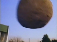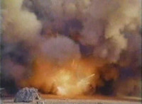 Smoke and sparks erupt amid a bursting with a rock nearby. |