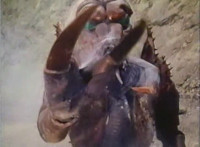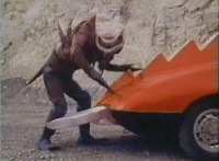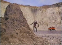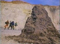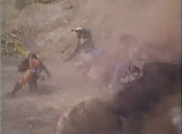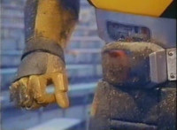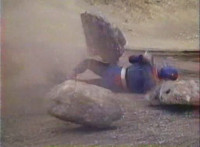 A sand tornado spins about in the quarry, before exploding into a huge pile of dirt. Gork leads the Generals in rushing to the other side of the dirt structure, talking as they do. Gork slaps his fist to his palm excitedly then pointing. Twister Bug pops out of the other side of the dirt mound, motioning victoriously, then suddenly he, and the Generals, all turn to see Magno driving into the quarry. Magno extends her claw mechanism forth, drives right into Twister Bug, snags him up onto her hood, then slams him into the dirt mound burstingly. Rocks fall upon the Generals, Robo Rider is flung from within, as is Super Blue, who falls amid the rocks. Magno deposits Twister Bug with the Generals as she drives off, Twister Bug recovering in time for Super Blue to pose at him. |