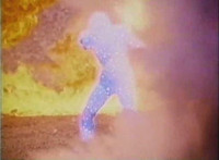 As a fire rages behind him, the glowing Super Blue is faced with an explosion. |