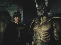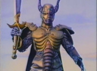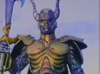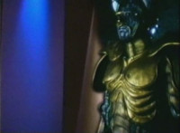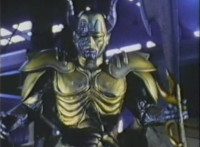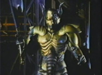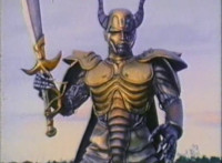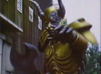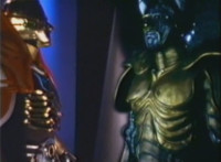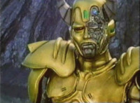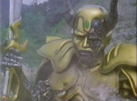 Masked Rider flips out of Dregonator's sword's reach, but he soon goes to strike again, so Masked Rider tries to block and gut punch in return, to no avail. Dregonator shoves him aside, then goes to slash, sparkily striking him on his back. Dregonator awaits his next move, and Masked Rider transforms into Super Gold mode. Dregonator slashes, Super Gold blocks it, dodges another, then gets sparkily slashed on the third swoop. Super Gold backhands Dregonator down, then aims his Ecto Ray forth and blasts Dregonator burstingly, knocking him back down. Dregonator's eyes glow golden, and he charges up his horns. Super Gold fires again, but the bursts fail to harm Dregonator, who zaps back with electricity, bursting our hero into a kneel. Dregonator approaches and slashes the Ecto Ray out of Super Gold's hand. |
