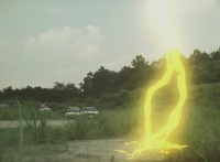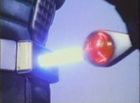 Masked Rider whips his glowing Electro Saber around, and tosses it forth. |