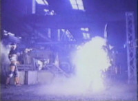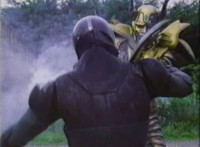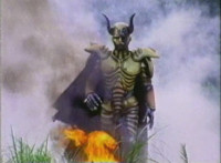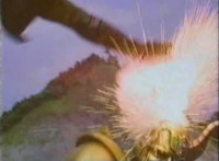 Recycled, per source; mirror-flipped; cuts follow-ups of Masked Rider impaling Dregonator, who turns back into Count Dregon, and goes kablooey. |