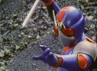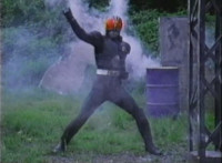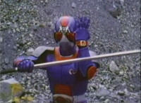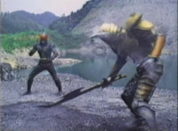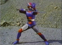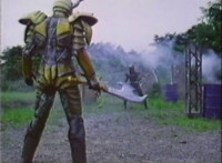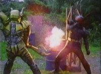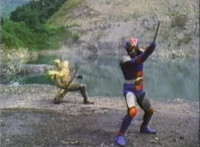 Dregonator slowly raises his sword while talking, then rushes forth. Super Blue poses, then leaps up and in a flash of energy, reverts to Masked Rider basic mode. He sparkily tweaks one of Dregonator's horns while flipping past him. As Dregonator staggers in a daze, Masked Rider lands, poses, then reaches downward. |