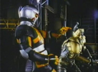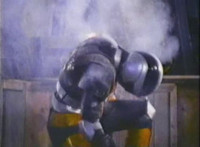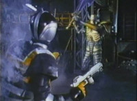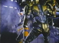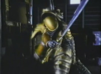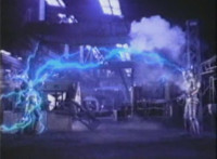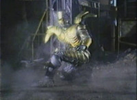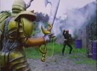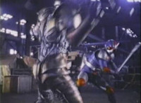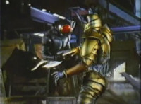 Masked Rider flees into the warehouse as Dregonator follows and attacks, our hero stumblng backward over some junk to avoid the blade. Masked Rider retreats, dodging sparkily slashes. |