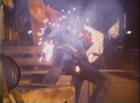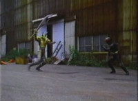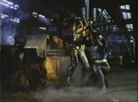Masked Rider does another pose, then jumpkicks forth at Dregonator, who dodges, then sparkily slashes Masked Rider a few times, including a miss or two against a barrel. Dregonator turns, sparkily slashes Masked Rider again, before sparkily jabbing him so hard he goes flying. Masked Rider lands, and is joined by Dregonator in front of a warehouse, each facing one another again. Dregonator slashes at Masked Rider, who dodges but his own hit is sword-blocked. Dregonator jabs his sword forth, Masked Rider is knocked over against a box marked with the title of a Traveling Wilburys hit song. |