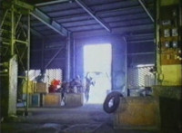 Transitions in; cuts follow-up of Masked Rider Warriors entering building. |