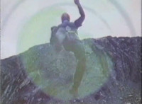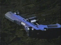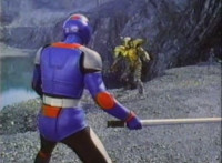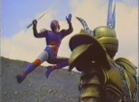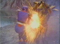 Now outside in a quarry overlooking a pond, Dregonator staggers along, before turning to face Super Blue, talking to him. Super Blue poses a bit, then leaps up and starts sparkily slashing Dregonator, hitting him every time. Dregonator finally falls to one knee as Super Blue poses with his saber. |