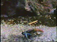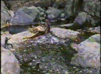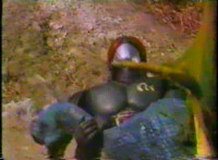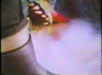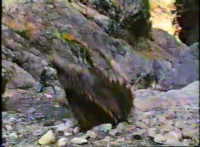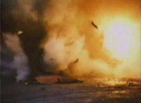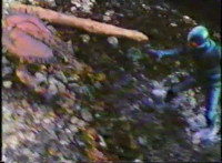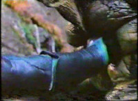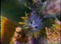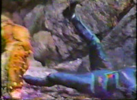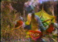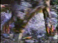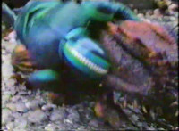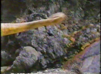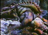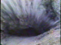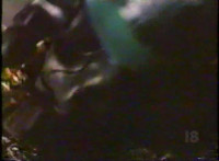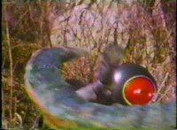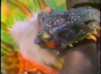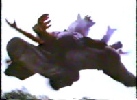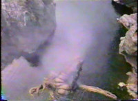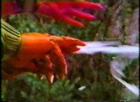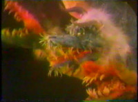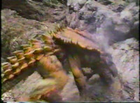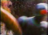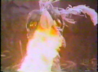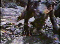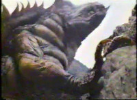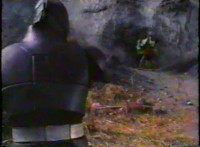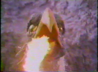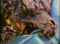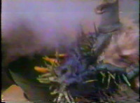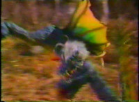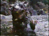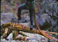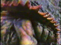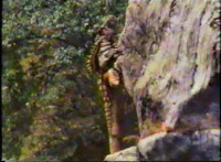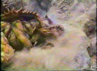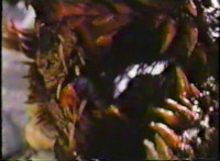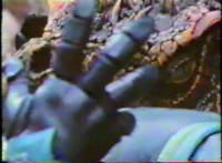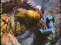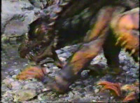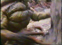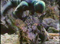 Cuts before he slaps at the monster some more, and cuts follow-ups of close-ups of MR. |