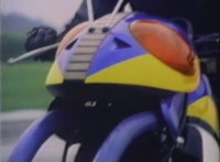 Close on Combat Chopper's side, Masked Rider's leg pressed near the crest. |