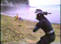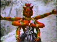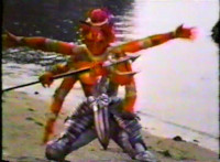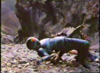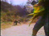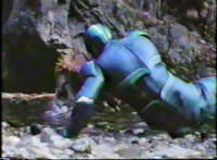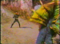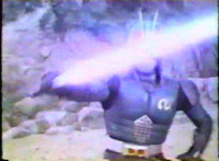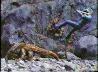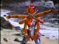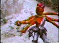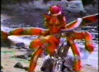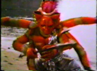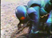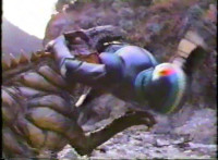 Continued, Manosect charges into action. Manosect strikes repeatedly at Super Gold, who dodges and blocks, before finally throwing a single punch that sends Manosect flying from the beach into a quarry, with Super Gold right behind him. Manosect tosses one of his daggers at Super Gold, who smacks it away. Manosect then tosses a pair of daggers, spark bursting Super Gold. Manosect gestures hands together and juts then forth, spraying white goo at Super Gold, who dodges the spoogey rain and rolls out of the way of the white shower. |