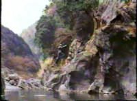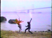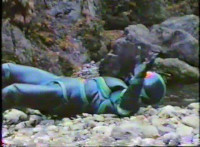Masked Rider hits Cyborgator square in the chest, sending him flying across the riverbank, onto the rocky shore. |