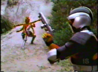 Masked Rider shoves Cyborgator aside, onto a large rock. |