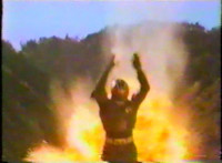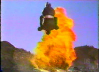 Dread Dragon explodes massively as Masked Riders stands with his back to him, arm extended. |