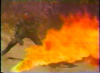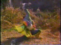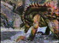 Dread Dragon spews fire, casuing a massive fireball explosion behind Masked Rider, who flips away from it, landing beside Dread Dragon, quickly reaching around and grabbing him by the tail. He struggles to keep a hold on the creature's appendage, before finally throwing the tail down, then leaping up and throwing a kick into his long and gangly neck. Dread Dragon staggers away, so Masked Rider poses facing him as he recovers, then spews more fire forth. Masked Rider dodges the flames, then leaps over, grabs Dread Dragon by the neck, and gets bit by his hand-heads. Our hero is agonized over this pain, gets pecked by the main head, and the chest mouth of the monster also spews steam, overwhelming him until he breaks free and gets smacked aside by Dread Dragon. Masked Rider rolls away, Dread Dragon approaches, whipping his tail around, hitting Masked Rider and sending him flying onto his back. Dread Dragon spews electricity from his head-hands, bursting dirt around Masked Rider. When the dust clears, Masked Rider is unharmed, leaps up, charges up a Rider Kick, and sends it right into Dread Dragon's main head explosively, knocking the monster over. |