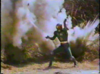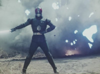 Close on Masked Rider, moving a little as the smoke clears behind him. |
